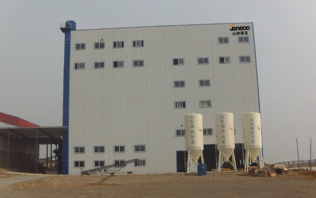 2014年9月,山東客戶采購(gòu)山推建友1套SjGJD060-3G型干混砂漿站成功應(yīng)用,用于預(yù)拌干混砂漿生產(chǎn)線,目前該設(shè)備使用效果良好。該設(shè)備料倉(cāng)位于主樓設(shè)備旁邊,計(jì)量位于料倉(cāng)下方,計(jì)量完成后經(jīng)輸送機(jī)、提升機(jī)后送入攪拌機(jī),生產(chǎn)率高,外觀雄偉,適合普通干混砂漿的生產(chǎn)。