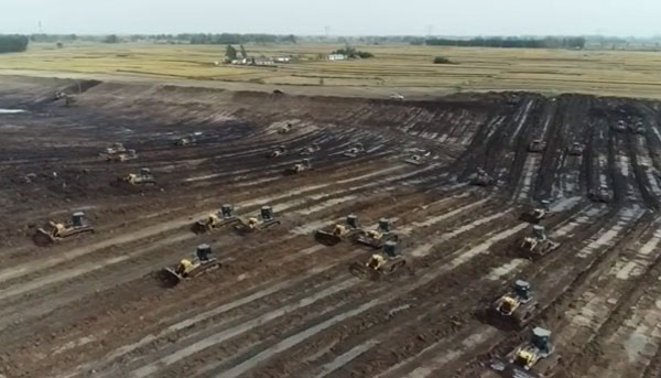山東某河道施工工地,使用近10臺(tái)山推推土機(jī)進(jìn)行土方作業(yè)。