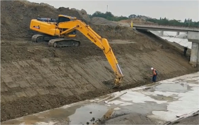 山東省內某河道開挖施工,山推SE215高效修坡施工,操控輕便、控制精準,精細化修坡作業(yè)。