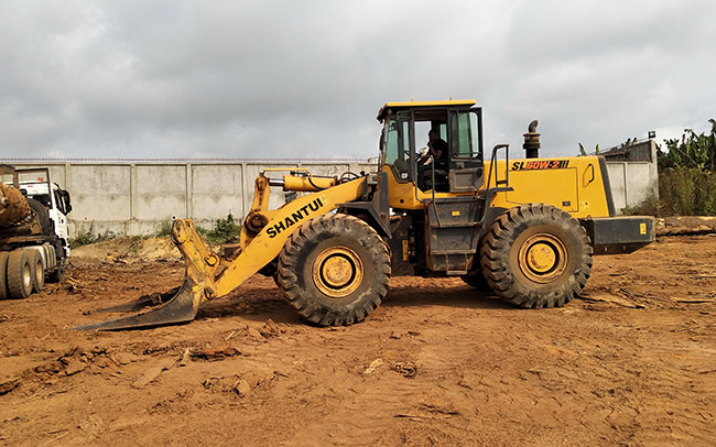 山推裝載機(jī)工作于喀麥隆某公司堆場(chǎng)及林地,裝配木料專用裝卸屬具。