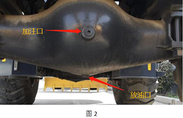 6、 工作完成后,將車輛停平穩(wěn),拉緊手制動,將前后橋的放油塞(圖2)堵拆下,放出橋包里的油液,用備用桶收集并妥善處理。將塞堵清理干凈。