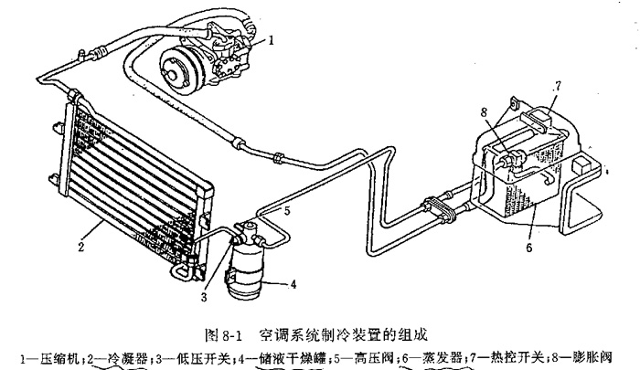 1-電磁離合器及壓縮機2-冷凝器3-低壓開關4-儲液干燥器5-高壓閥6-蒸發(fā)器7-熱控開關8-膨脹閥